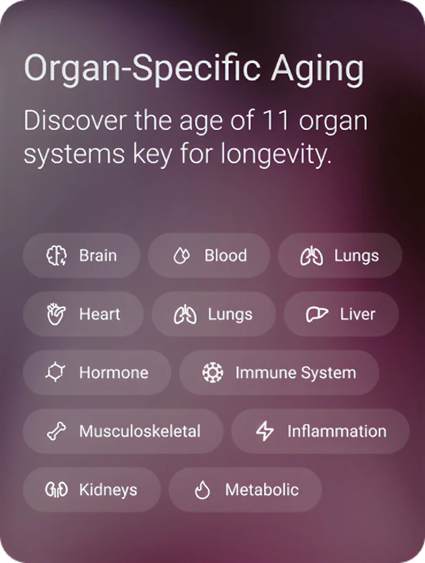 - Edad de 11 Sistemas Orgánicos (SYMPHONYAge): Desglosa tu edad biológica en sistemas clave (Corazón, Cerebro, Hígado, etc.), permitiendo un enfoque preciso en los órganos que más lo necesitan.